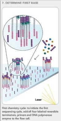 - Step 1:将加好接头的 DNA 阳性加入到 flowcell 中,再加入特异的化学试剂,使得序列的一段与 flowcell 上面已经存在的端序列通过化学键相连。