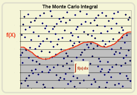 计算简单积分:积分其实就是一条曲线与坐标轴之间围成的面积,因此也可以用蒙特卡洛来计算积分,比如下面,我们只需要找到一个包围这条曲线的一个正方形,就可以”撒豆子“确定两个面积的比例计算出积分。