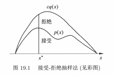 - 选择概率密度函数为 $q(x)$ 的概率分布,作为建议分布,使其对任一 $x$ 满足 $cq(x) \ge p(x)$ ,其中 $c > 0$.