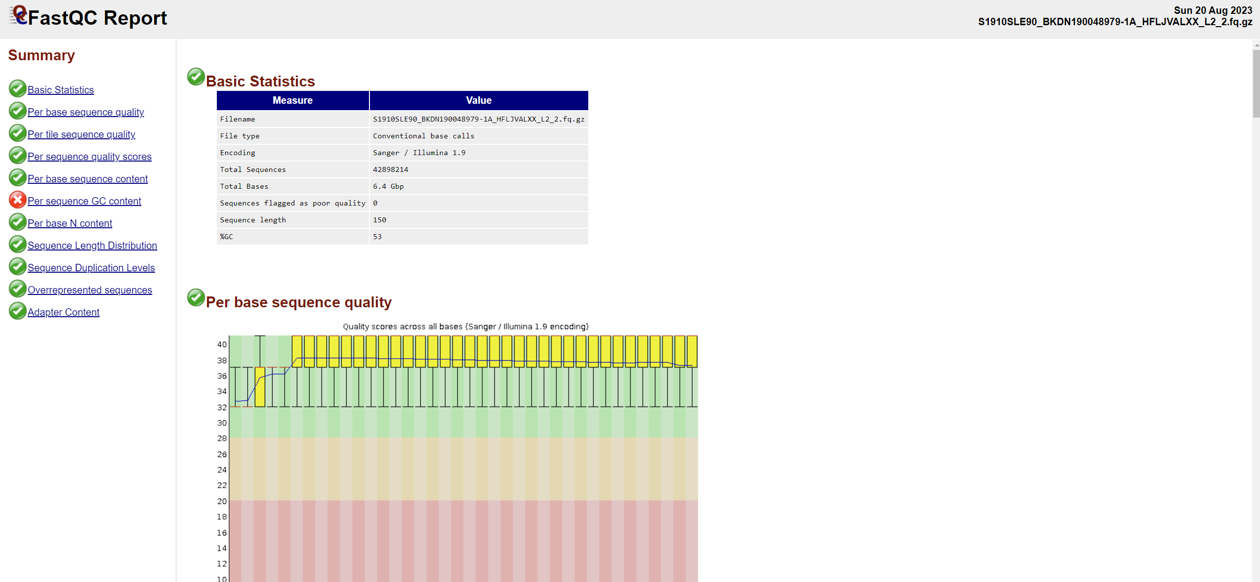 | Per base sequence quality | 每个位置的碱基质量值分布, 反映序列质量在不同位置的变化, 判断是否存在特定位置质量下降 |