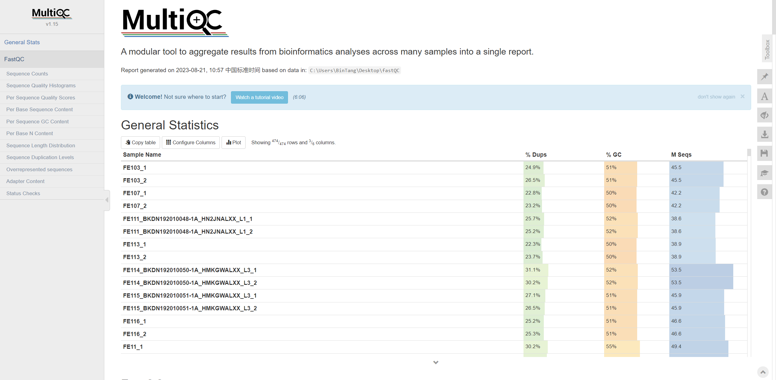 当有多个文件需要分析时,可以使用 multiqc 来同时查看多个 FastQC 的信息: