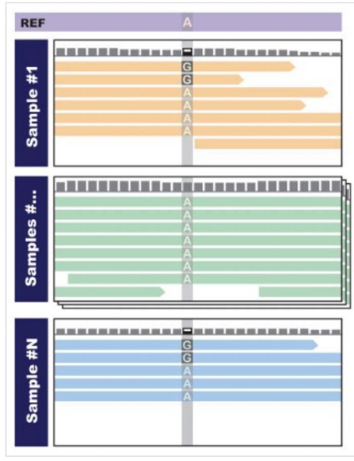 人与人之间存在差异的遗传位点非常少,超过 99% 的遗传位点都是一样的,整个 call variants 的过程,简单地概括就是将 Sample 跟参考基因组 Reference 进行比对,得到样本的基因组信息,记录存在遗传变异的位点。 这个过程包括质控、序列比对、SNP 和结构变异检测等下游分析: