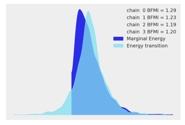 当为高维的时候,我们将这些变量全部绘制出来十分不方便,如果是用 NUTS方法抽样,可以使用energy plot查看是否收敛: